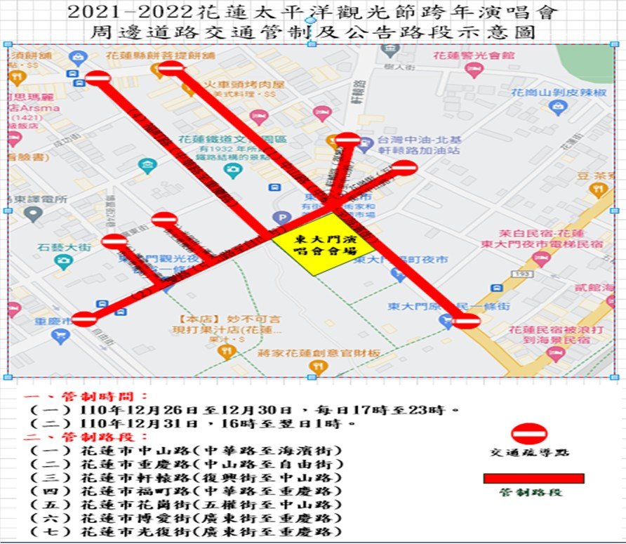 花蓮警分局表示,跨年演唱會是年度盛事,尤其今年更是連續舉辦6日,預計會吸引大量觀光客湧入,為紓解活動期間的大量人潮,警方每日從下午16時至23時將針對活動會場周邊進行交通管制,另考量現場工作人員可能提早進駐布置,警方將依據活動現場情況,提早或延後管制,針對管制區內的住戶、商家及飯店出入車輛,則採取彈性管制及適度放行,儘量減少影響。警方也呼籲屆時需行經管制範圍民眾,提前改道行駛,避免耽誤行程。