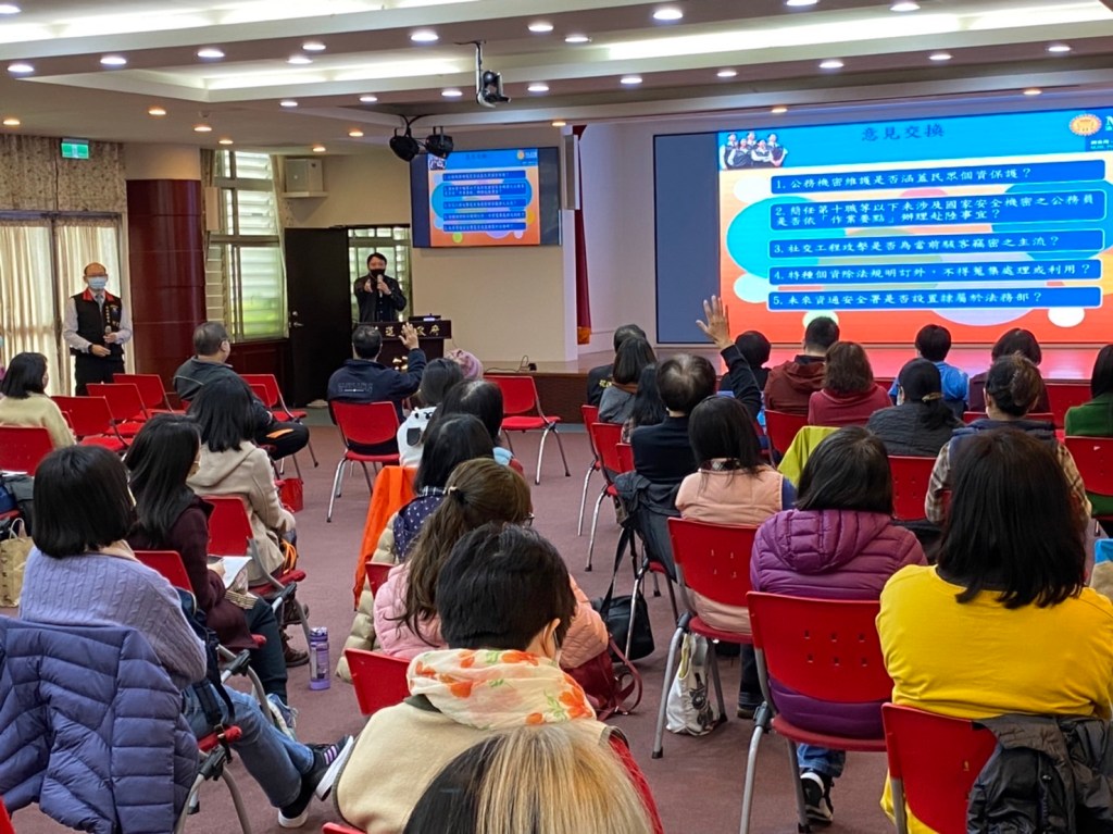 另外,針對廉政工作中相當重要之「機關安全與公務機密維護」,邀請擁有豐富實務閱歷的法務部調查局花蓮縣調查站副主任張進明講授。除詳盡講解法令,張副主任亦輔以許多時事或工作上常見的洩密案例,將實務與艱澀的法律條文相結合,協助與會人員更易理解吸收。張副主任特別提醒現今網路與即時通訊軟體逐漸成為公務溝通之重要媒介,近年又因防疫須整備遠距辦公環境,希望同仁在面對資安及機密外洩等問題時能提高警覺,以營造受民眾信賴的優質公務環境。
