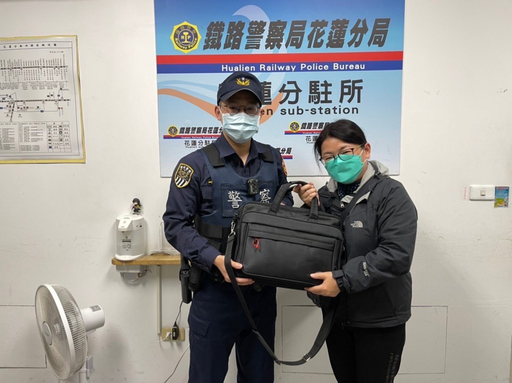 花蓮所警員鄭凱軒於年前擔服守望勤務,見花蓮車站候車大廳有一黑色手提袋,內有ipad及提款卡等重要物品,查訪附近站員及旅客都無看見此物之主人,因擔心物品遭宵小覬覦,故在原地等待民眾認領,許久未見民眾來認領,並在大廳來回巡守,確認無民眾來尋找後,便將黑色手提袋帶回所內。