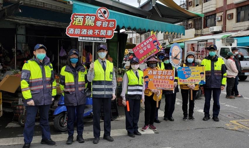 臺東縣警察局關山分局池上女義警分隊們於今(30)日一大清早,在池上分駐所所長連家興的帶領下,與員警及警察志工舉著「酒駕零容忍」及「行人停看停」等各式交通安全立牌,掃街宣導「111年加強重要節日安全維護工作」!另外發送「1元行車指南紅包」、「拍拍圈」及「反光貼紙」等宣導品,還貼心地幫長者們一一貼上,獲得現場民眾一致好評!女義警們整齊的服儀及親切的微笑,更成為市場的新「嬌」點,宣導效果倍增啦!