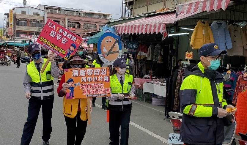 「111年加強重要節日安全維護工作」自1月24日22時起至2月7日24時止,為期15日,以「治安平穩、交通順暢、民眾安心」為工作主軸。關山警察分局各分駐(派出)所警力及協勤民力全力投入,就是要讓民眾能安心過好年!於(30)日一大清早,池上年貨大街(管制時間:1月30至1月31日,每日6:30至11:30,禁止車輛進入,機車及自行車可)正式開賣,一時間湧入大批趕辦年貨的民眾,池上分駐所所長連家興隨即率領同仁、女義警及警察志工們,趁此機會舉著警察局交通隊統一製作的「酒駕零容忍、指定駕駛、開車請繫安全帶、禮讓行人」等交通安全立牌掃街宣導!另也宣導於年節連續假期期間,警方有提供舉家外出及大額存(提)款服務,請民眾多加運用!因於年節前夕,女義警們許多親朋好友從外縣(市)返鄉過年,看到她們整齊的服儀及親切的微笑,都主動上前稱讚「實在水噹噹唷」!讓她們成為市場新「嬌」點,宣導效果啵棒!