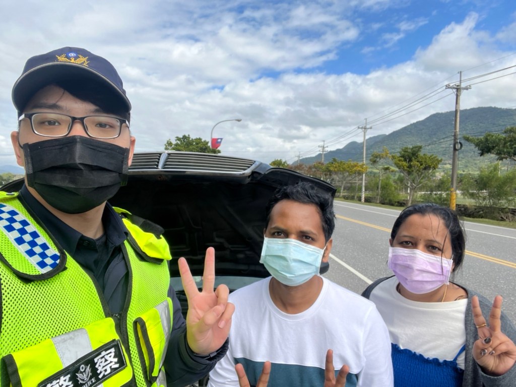 警員周峻羽表示,到場後以警用M-police小電腦得知2名皆為印度籍,且都有合法居留證,因語言文化不同,但服務無國界,所以用英文來與RAO夫婦溝通,溝通後得知汽車不知什麼原因發不動,經檢視研判應該是電瓶沒電導致引擎發不動;由於修車廠因為過年期間暫停營業,靈機一閃想到派出所附近的小吃店好像有電霸,故前往向小吃店老闆借來電霸使用,最終順利幫助車輛發動引擎,解決此次的困難! 原本焦急不安的印度籍夫婦終於露出笑容表達感謝;離去前向警方說之前就聽說東部的警察非常熱情,這次真的讓我深深體會!上車前詢問May I take a picture with you ?故以花蓮綿延不絕且一望無垠的山脈來取景,拍下這張照片來留戀。