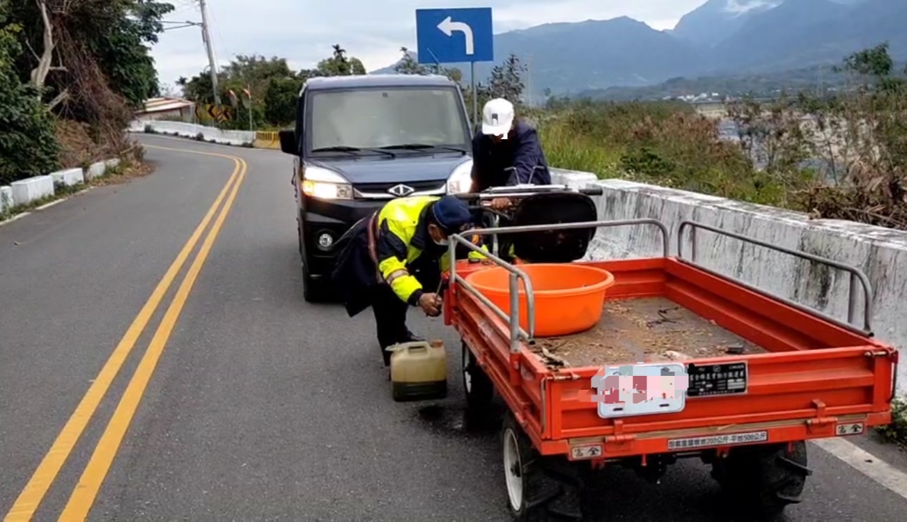 余所長查看搬運車後發現該車汽油已經耗盡才無法發動,便向林民告知,請其在原地等待,同時為顧及人車安全,所長將告示牌擺設在搬運車後方警示用路人;自己駕車前往富里加油站購買汽油,所幸該車經過汽油添加後,順利發動行駛,幫助林民解決車輛無法行駛之困境!