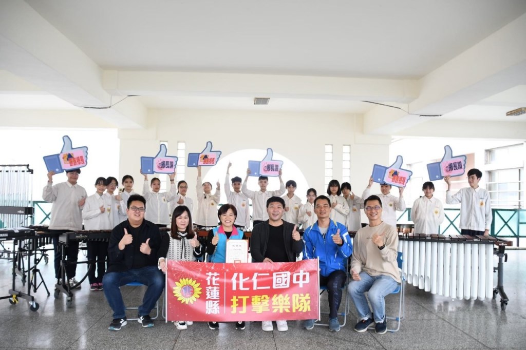 猶記得6年前以創意十足、臨場應變黑膠帶貼鞋的化仁國中打擊樂,以黑馬之姿成軍後即獲得打擊樂合奏團體組優等佳績,躍上全國版面,參加110學年度花蓮縣音樂比賽,再以總平均九十點七三的高分榮獲全縣「特優第一名」,創下連續三年取得縣代表權佳績,即將於3月前進全國競技殿堂,鄉長游淑貞特別前往學校嘉勉與祝福,盼優異在地學子繼續為花蓮縣、吉安鄉爭取最高榮譽。 書香校園中一場令人驚豔的音樂饗宴繚繞於四樓迴廊間,化仁國中「打擊樂團」十七名團員以木琴、鐵琴、鍵盤樂器鋪陳出優雅弦律,與定音、爵士等皮革鼓類、打擊樂器相互競奏,演奏比賽時的自選曲目「美星降臨的夜晚~第二樂章」,曲風時而輕快、時而震撼,搭配孩子們如旋風般走位演奏,交織成極為豐富的樂曲,呈現高難度無指揮老師的聯合展演。投入表演現場的游淑貞應邀上台,與打擊樂團共演一段精湛十足的才藝處女秀,透過眼神與孩子交流、感受每一次的頻率呼吸,絕佳的互動默契點亮繽紛擊樂的藝文薪傳。 化仁國中打擊樂團自2016年9月成軍,成軍6年4度進軍全國賽,校長梁仲志指出,化中積極發展多元才藝特色,其中打擊樂團員來自全校各班,利用每週社團課時間進行練習,透過音樂老師趙純瓏以愛的音符陪伴學生成長,發現化中的孩子擁有超優的節奏感、音感,非常適合發展打擊樂,同時,也讓學區內國小發展能在原有打擊樂基礎上,無縫延續音樂學習,透過藝能深耕得以精進延伸。 學生團員黃冠宗特別感謝游鄉長提供「繽紛吉安芋見幸福及芋罷不能」的展演舞台,讓各界都能看到化中打擊樂團卓越表現。梁仲志也有感表示,學校經費有限,每筆開銷都要花在刀口上,化仁國中的成長有賴於各界的協力,特別感謝縣長徐榛蔚給予花蓮縣最優質教育推展、吉安鄉長游淑貞大力支持,連續多年引入社會能量,挹注各項資源,讓學校得以結合公部門多元管道,帶動教育永續發展,助化中孩子圓夢,找到適性發展舞台。