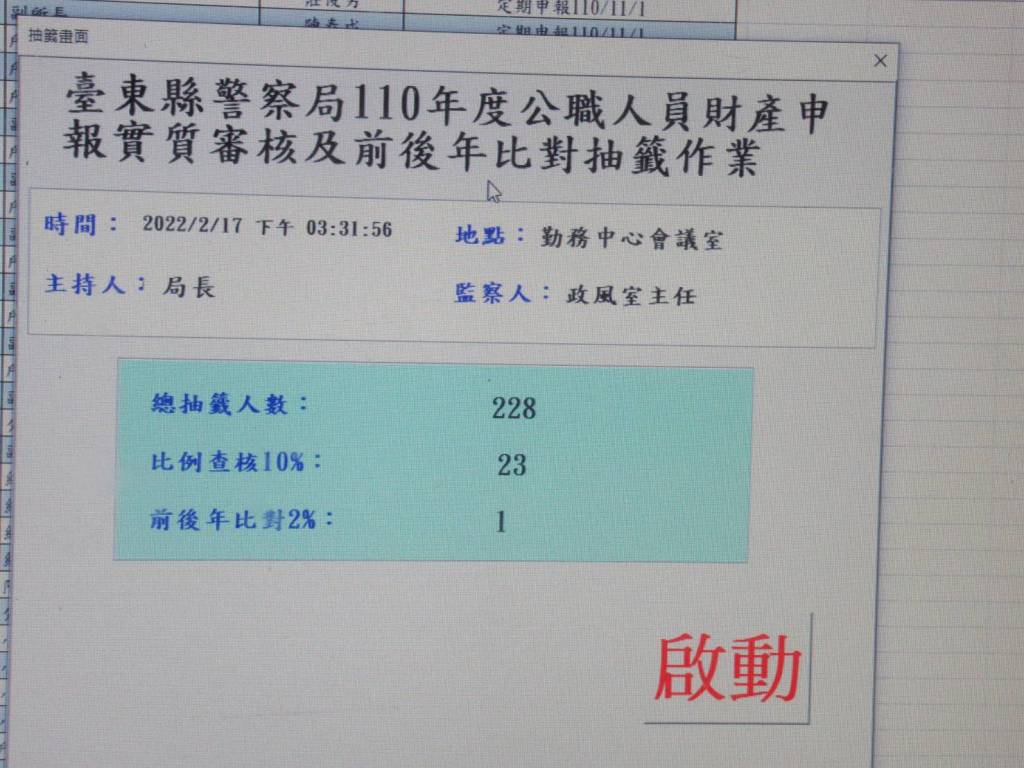臺東縣警察局為落實公職人員財產申報審核制度,促使公職人員誠實申報財產,業於111年2月17下午14時在警局勤務指揮中心會議室,舉行110年度公職人員財產申報資料實質審查公開抽籤作業。110年度受理公職人員財產申報計有228人,依抽籤比率10%抽出23人進行實質審查及依抽籤比率2%抽出1人進行前後年財產比對,抽籤作業由葉局長親自主持。