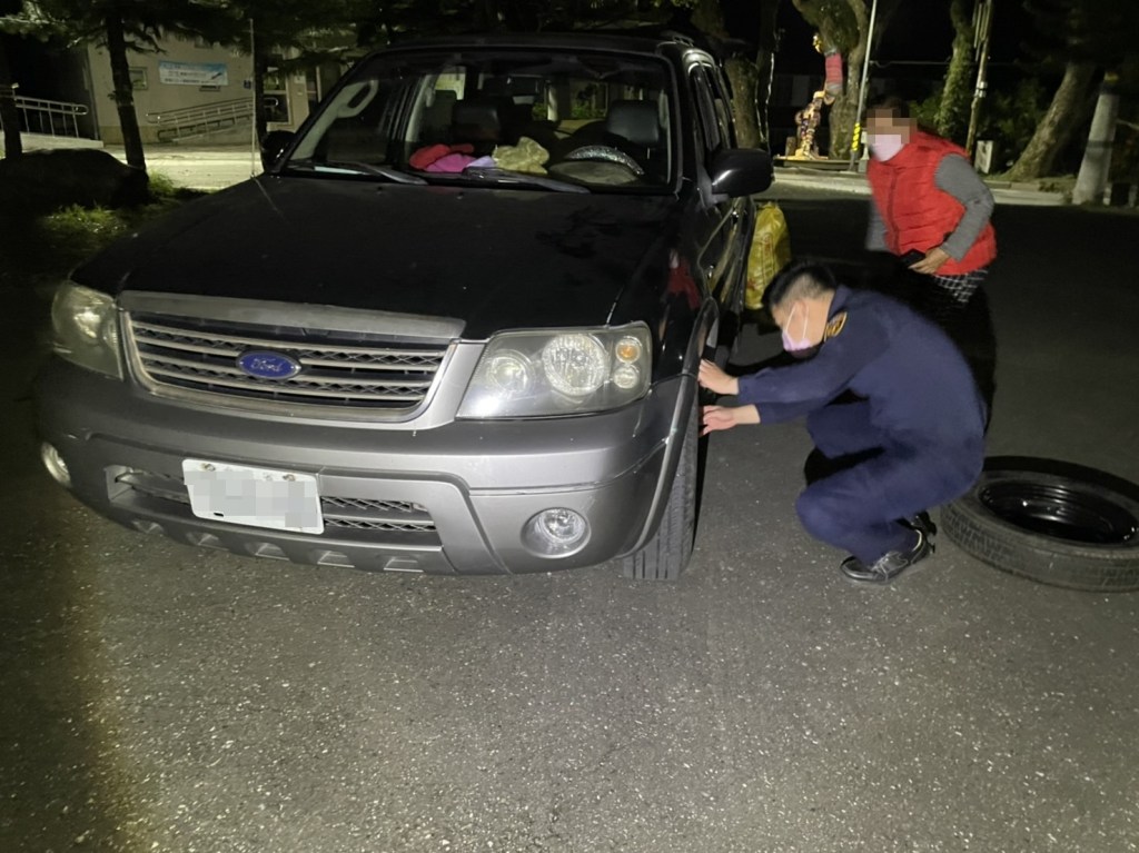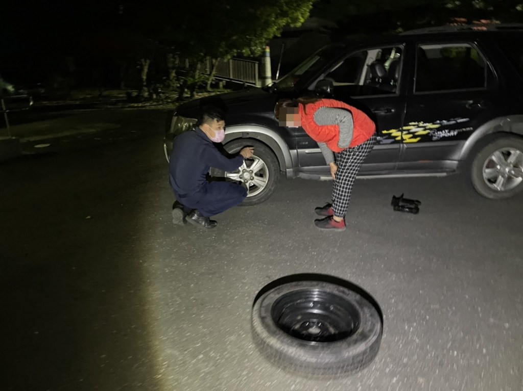 員警查看後研判輪胎應是遭到尖銳的鐵釘剌穿才會消風,立即陪同羅女到後車廂拿取備用輪胎,並協助將消風的左前輪更換後,請其小心駕車,返家前務必要再到汽修場檢修輪胎將備胎換下,以免影響行車安全,羅女非常感謝員警的協助換胎,讓這趟購物的行程多了意外的暖心收獲。