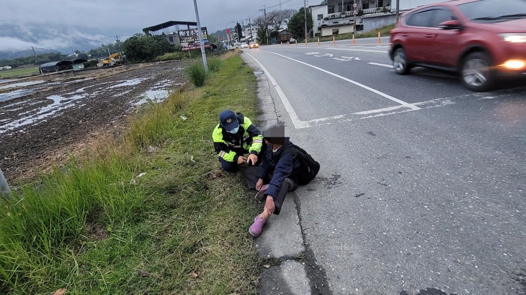 日前,花蓮縣警察局玉里分局竹田派出所所長鍾岳韓、警員江姵暶執行巡邏勤務,巡經臺9線293公里處,在路口停等紅綠燈時發現1名婦人坐於路旁用手按壓著膝蓋,2員見狀唯恐婦人遭追撞發生交通事故,便迅速將巡邏車停在路旁警戒,隨後下車查看,靠近時濃濃酒氣不時撲鼻而來,經詢問得知,林婦前往朋友家飲酒,在三杯黃湯下肚後不小心過量,返家途中卻不勝酒力,一時頭暈目眩而跌倒,造成膝蓋有破皮擦傷情事;同仁詢問林婦是否需要送醫,其表示膝蓋的擦傷並無大礙;2員便將其扶上巡邏車,再以巡邏車平安送返家;返家後林婦向警方頻頻道謝,感謝警方的協助。