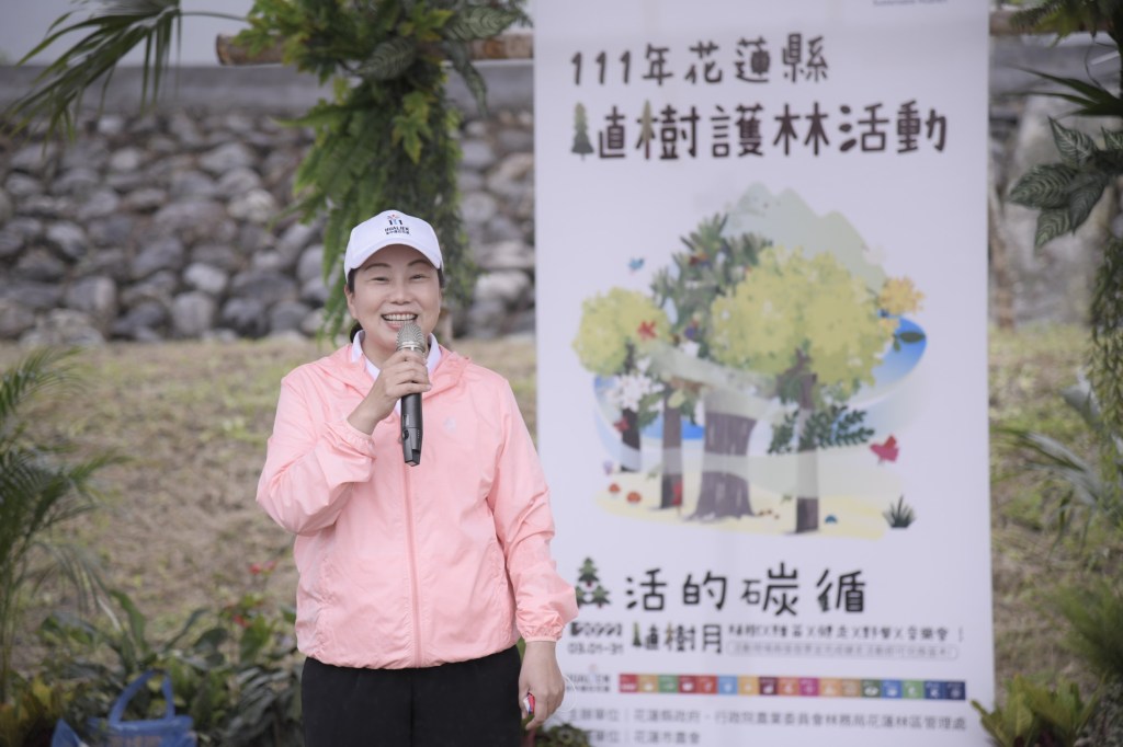 縣長徐榛蔚致詞提到,花蓮縣政府持續朝著聯合國17項永續指標以及淨零碳排的目標邁進,這幾年不斷的種樹,讓我們能顧碳更能夠減碳,花蓮縣綠覆蓋率逐年增長,感謝每一年合作無間的林管處以及行政院東部聯合服務中心前來共襄盛舉,還有花蓮縣議會議員們的支持,並肯定花蓮市農會對此次的活動全力策劃,最後呼籲大家共同珍惜每一寸土地。