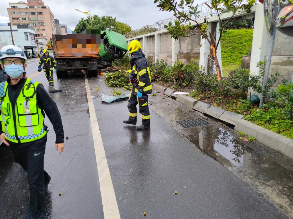 駕駛人連姓(73年次)駕駛營業曳引附掛拖車沿海岸路南往北門直行,於通過民樂三街口時,疑因過彎不慎自撞圍牆與路樹發生交通事故,經救護人員救出後送往門諾醫院,目前得知駕駛人大腿與肋骨、身體多處骨折,意識不清,經抽血檢測,駕駛人並無酒駕情形,初步研判肇事原因為該車為天雨過後地上濕滑、疑似車速過快失控自撞。