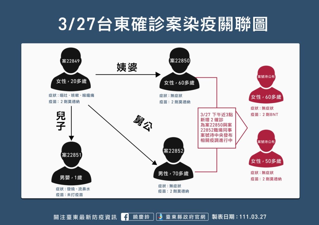 饒慶鈴於今日疫情說明記者會中表示,衛生局昨夜接獲通報第一起案22849(20多歲女性、卑南鄉民),3/26出現頭痛噁心症狀就醫後採檢確診,縣府擴大採檢又篩出5名個案,包括案22851為她1歲多的兒子,因為流鼻水、發燒等症狀,曾前往初鹿診所看診;而案22850及22852則為相關照顧者,各為約70歲女性、男性,目前無症狀,活動範圍多在初鹿地區及部分臺東市區。下午新增2個案皆無症狀,為案22852相關工作友人。