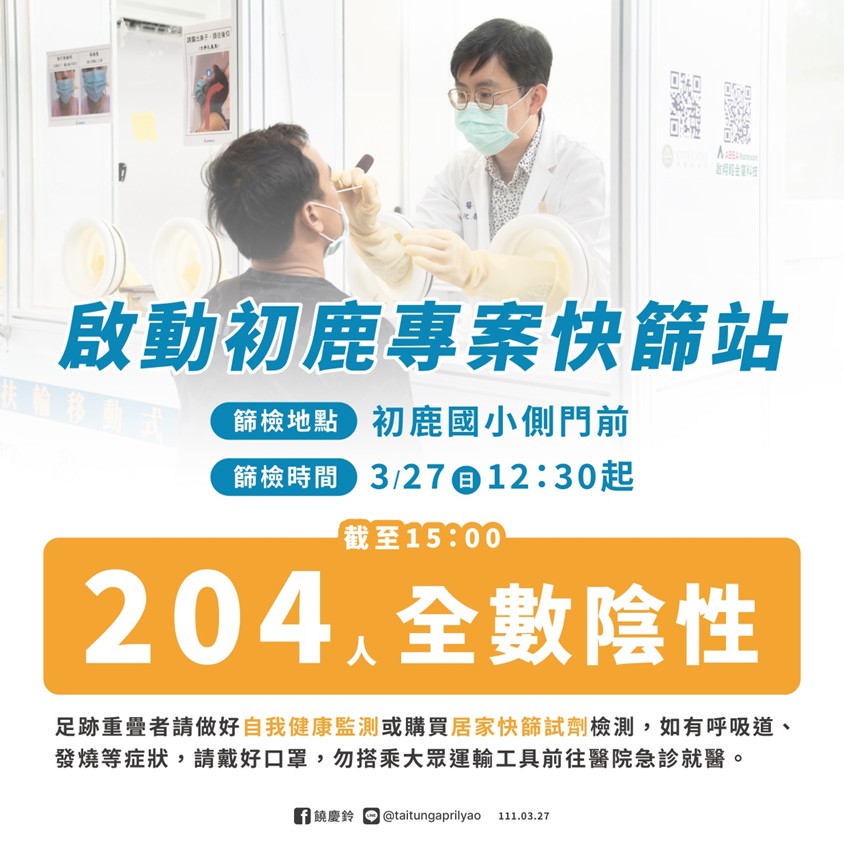 為盡早阻斷社區傳染鏈,縣府緊急協調卑南鄉衛生所及醫檢師公會,在初鹿國小側門前啟動快篩,截至下午3時共篩檢204人,全數陰性,快篩站將持續開設並滾動式調整,請當地鄉親盡快前往篩檢。另外,初鹿國小、初鹿國中明(3/28)日將停課1天加強校園清消、初鹿國小4/2的百年校慶也將延期辦理。