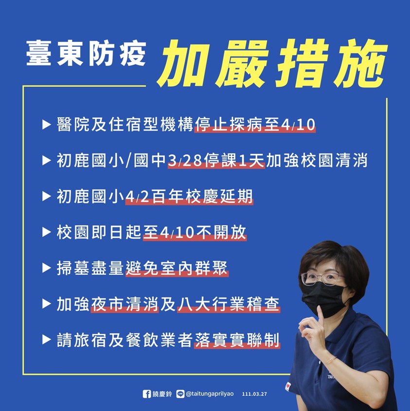 饒慶鈴強調,緊接就是清明連假,將有大批鄉親返鄉及遊客來臺東,對於防疫必須嚴陣以待,臺東縣醫院及住宿型機構目前停止探病兩週至4/10,校園即日起2週內不開放至4/10,運動會延期辦理或僅校內賽,校外人士進入校園洽公需附小黃卡或快篩證明。縣府將加強夜市清消及八大行業稽查,也請各旅宿及餐飲業者務必落實實聯制。
