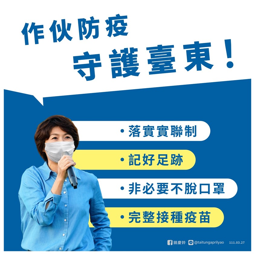 另呼籲鄉親做好個人防護,完整接種疫苗以保護自己,各鄉鎮市衛生所、醫院及診所持續提供接種服務,至4/3前接種資訊皆公布在臺東縣衛生局官網,請鄉親盡速自行電話或網路預約,並提醒民眾落實實聯制、非必要不脫口罩、將足跡路線記清楚,如有需要才能確實提供。