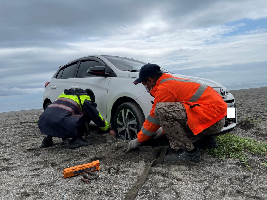 新城警分局和平派出所警員謝函穎獲報後即刻趕赴現場,發現廖姓男子所駕駛的白色自小客車困在沙灘中,車輛底盤幾乎已全部陷入沙灘,要移出顯然有困難,員警詢問廖姓男子是否要請拖吊業者到場協助,經廖男同意後,員警立即通知拖吊車業者至現場協助,後經拖吊業者到場,使用繩索及吊臂終將車輛拖離沙灘,廖姓男子見狀後非常開心並表示當車輪陷入沙灘時,還看四周附近都沒有其他釣客,而且自己對當地也不熟悉,最後只好硬著頭皮向警方求助,沒想到警方來的如此迅速,對此真的非常感謝警方為民服務的精神。