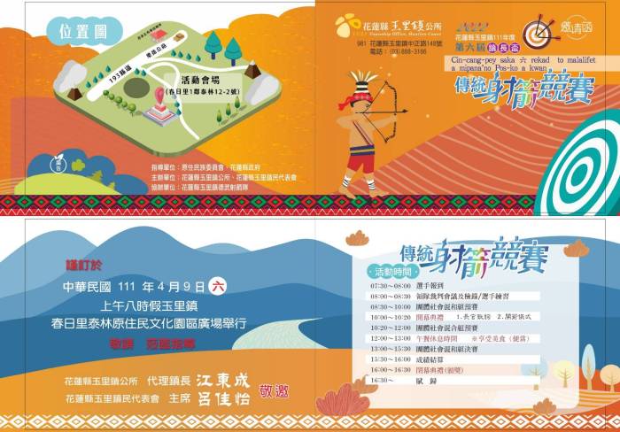 4月9日玉里鎮公所將於馬太林原住民文化園區舉辦「第六屆鎮長盃傳統射箭競賽」邀四方遊客共襄盛舉