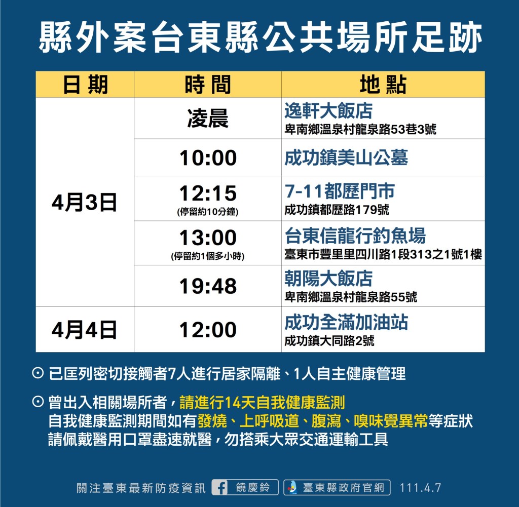台東縣衛生局表示,今日接獲基隆市通報,有一確診案例4/3凌晨自行駕車南下回台東,當天在成功美山公墓掃墓並停留縣內一天後,4/4下午在開車回基隆,衛生局目前已匡列7位密切接觸者居家隔離及1位自主健康管理。