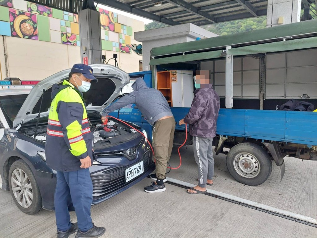 所長立即在該貨車後方放置故障三角警示牌,提醒後方加油車輛注意,經檢視該貨車確實疑似電力耗弱無法啟動,所長立即以巡邏車備用之接電線連接巡邏車與小貨車電瓶後,果然使小貨車正常啟動,宋男向警方表示早上開車載朋友從新城鄉住家出發沿著台11線來到豐濱遊玩,沒有注意到車子電瓶電力即將耗盡,在熄火加油後即無法再啟動,看到巡邏警車經過就趕緊攔車求救,對於警方的即時協助深深表達感謝之意。