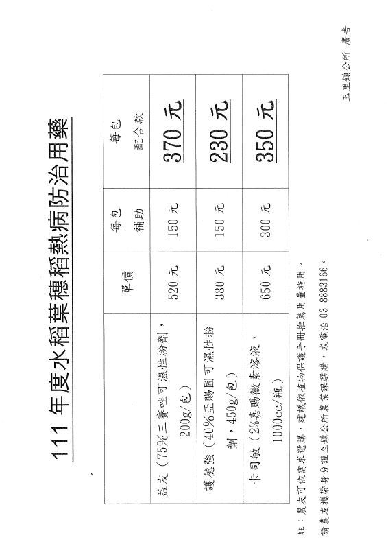 公所販售的稻熱病防治藥劑,益友(75%三賽唑可濕性粉劑200g)每包由公所補助150元,農民須支付370元;護穗強(40%亞賜圃可濕性粉劑450g)每包補助150元,農民須支付230元;卡司敏(2%嘉賜黴素溶液1L)每包補助300元農民則需支付350元。農友們可依需求選購,並建議依植物保護手冊推薦用量施用。選購時請攜帶身分證。