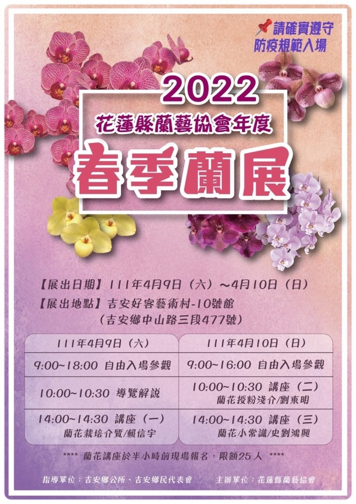 吉安鄉公所協力花蓮蘭藝協會連續三年於好客藝術村打造繽紛花卉燦眼世界!即日起一連2天於好客10號館辦理年度「春季蘭展」,開放民眾免費入館參觀飽覽各式各樣漂亮珍奇的好花,同時舉行三場次的蘭花講座課程,深入分享養蘭的實用專業知識。鄉長游淑貞表示,春季百花齊放、艷麗爭鳴,春季蘭展充分展現大自然浪漫之美,邀請鄉親把握展期、配合防疫規範,一起帶著家人共同造訪全世界品種蘭花匯聚的精采盛宴!