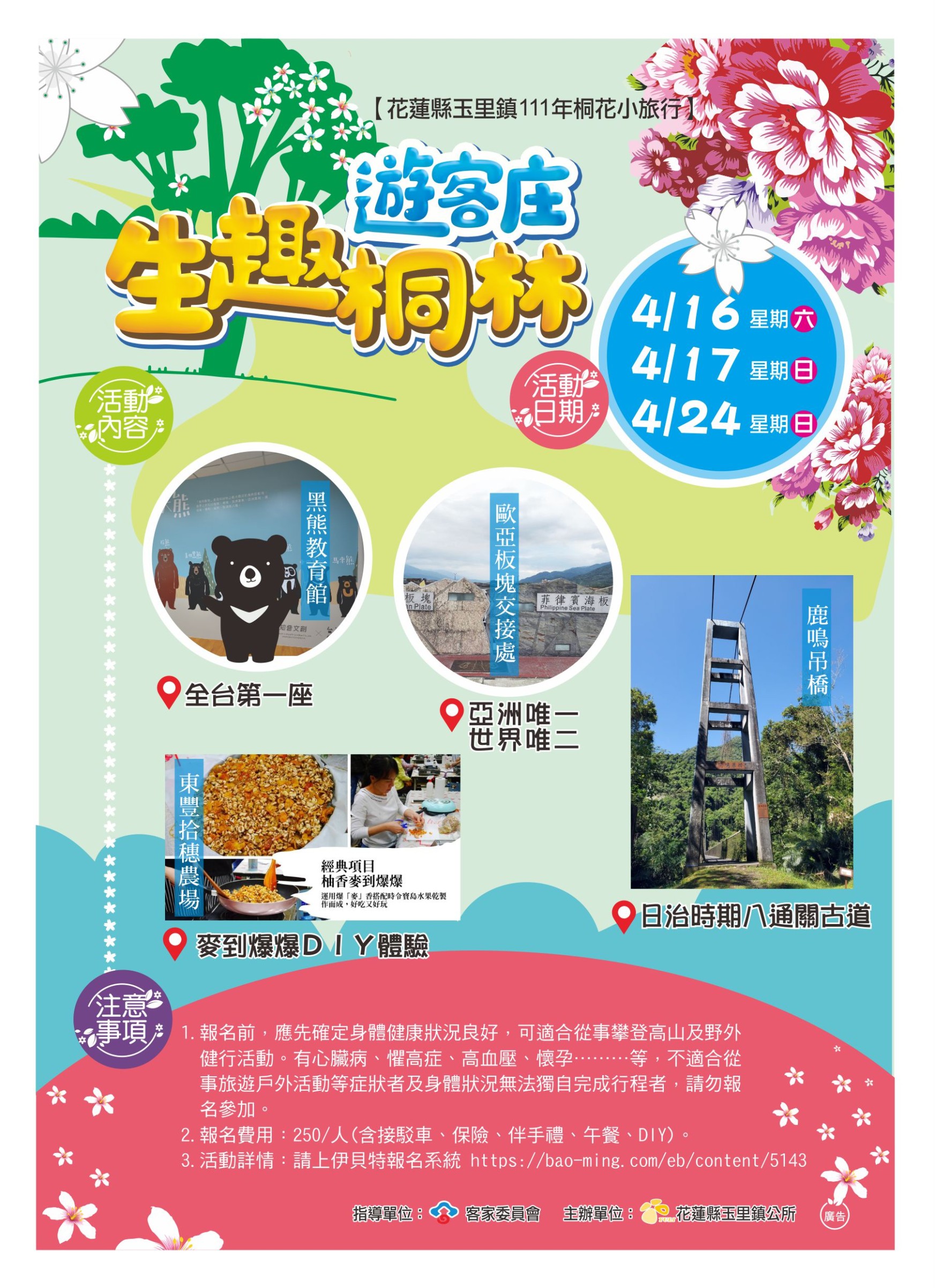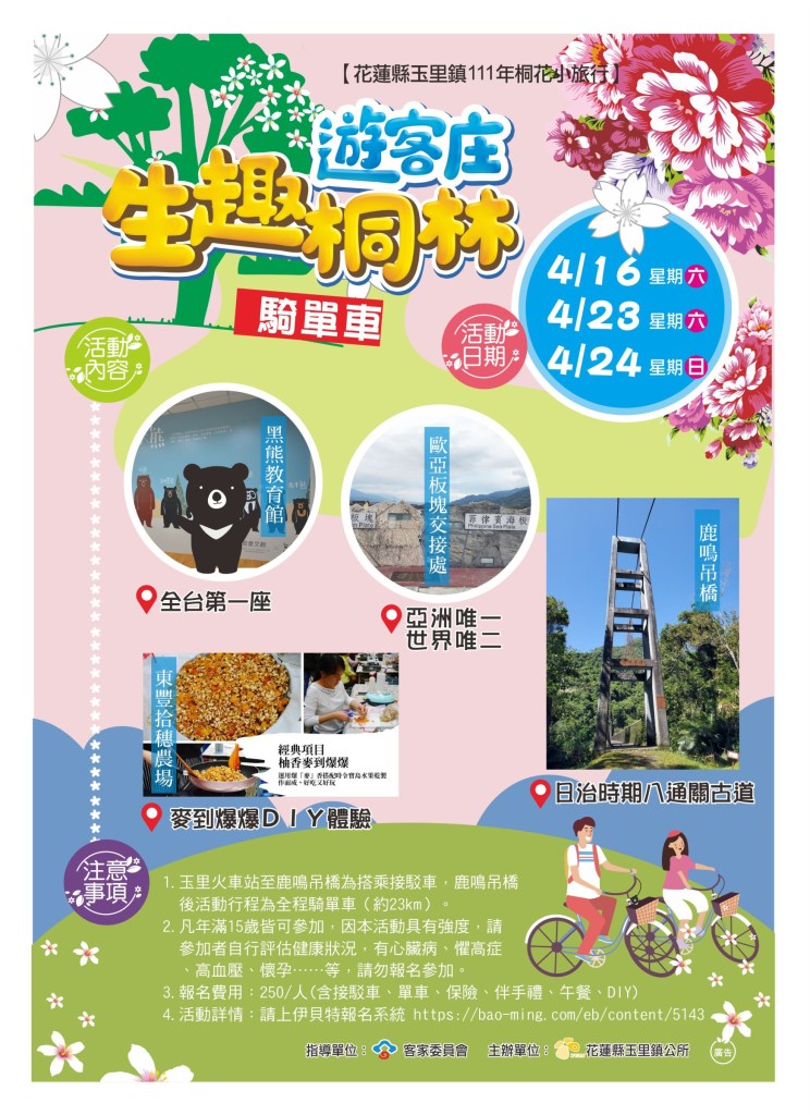 玉里鎮公所於111年4月16日、4月17日、4月23日、4月24日舉辦「【生趣桐林遊客庄】花蓮縣玉里鎮111年桐花小旅行」,春季來臨、桐花盛放,桐花小旅行將在這周六(16)日舉辦第一梯次,相信屆時將會為遊客留下難忘的美好回憶。
