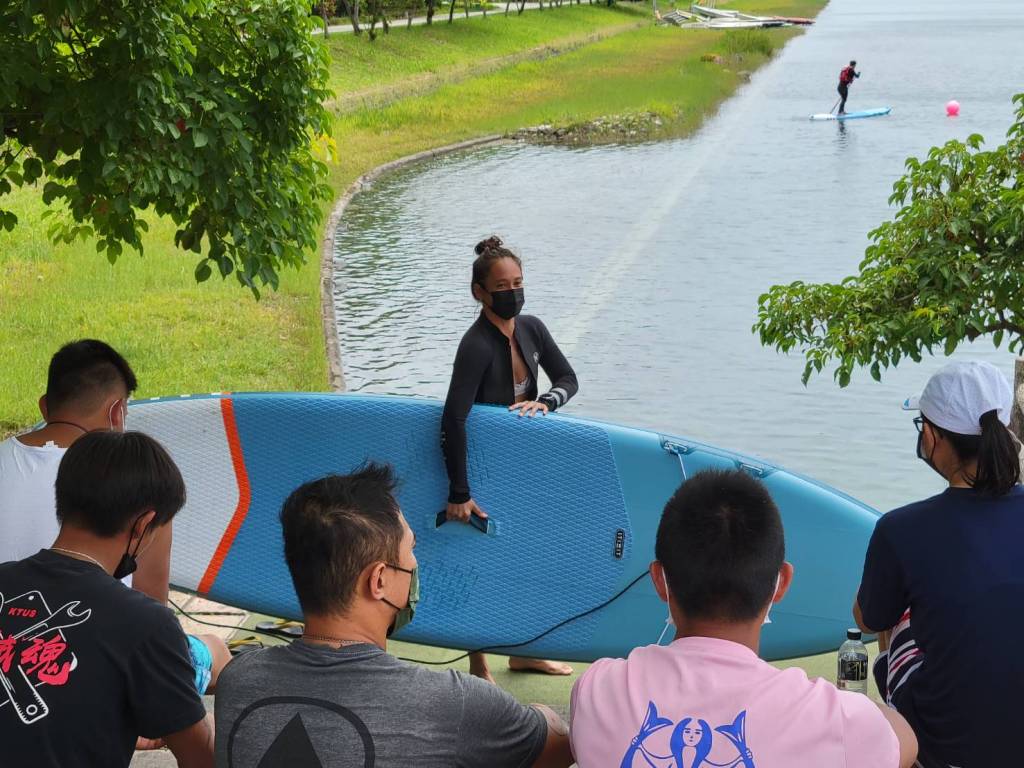 縣府交通及觀光發展處余明勳處長指出,今(111)年SUP丙級教練證照班共開辦3班,第一梯次SUP立式划槳丙級教練證照班9日在活水湖開訓,昨(10)日上午課程著重水域安全救援面向,學員互相練習拋繩救援、翻板救援等,並舉行證照考試,考科包含試講試教及術科測驗限時3分鐘以SUP規定動作完成繞標划行,今(11)日進行課程最後階段的實習。其中來自東河鄉的立式划槳業者,提到其實遊客體驗也經常要求專業教練服務;也有來自蘭嶼的老師,希望未來能帶學生體驗SUP。