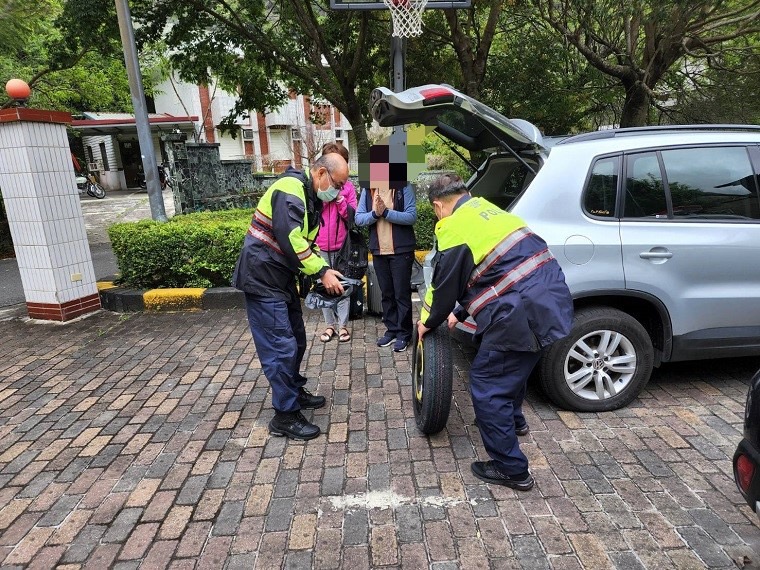 日前新城警分局天祥派出所所長葛厚遠、警員李文光於下午4時許接獲民眾報案,表示自己所之車輛行經台8線166.3公里處(白楊步道風景區)時,右後車輪突然傾斜,下車查看發現右後車輪壓到螺絲釘消氣扁平,但由於附近都沒有修車廠,求助無門只好先開至天祥派出所請求協助,途中鋼圈發出聲響,行駛時車身明顯偏向一邊,民眾表示非常害怕會發生危險,一抵達所內後趕緊將事情經過告訴警方,所長葛厚遠、警員李文光立即協助更換備用輪胎,使其順利下山修補輪胎,民眾對於警方的熱心服務表達感激之意。