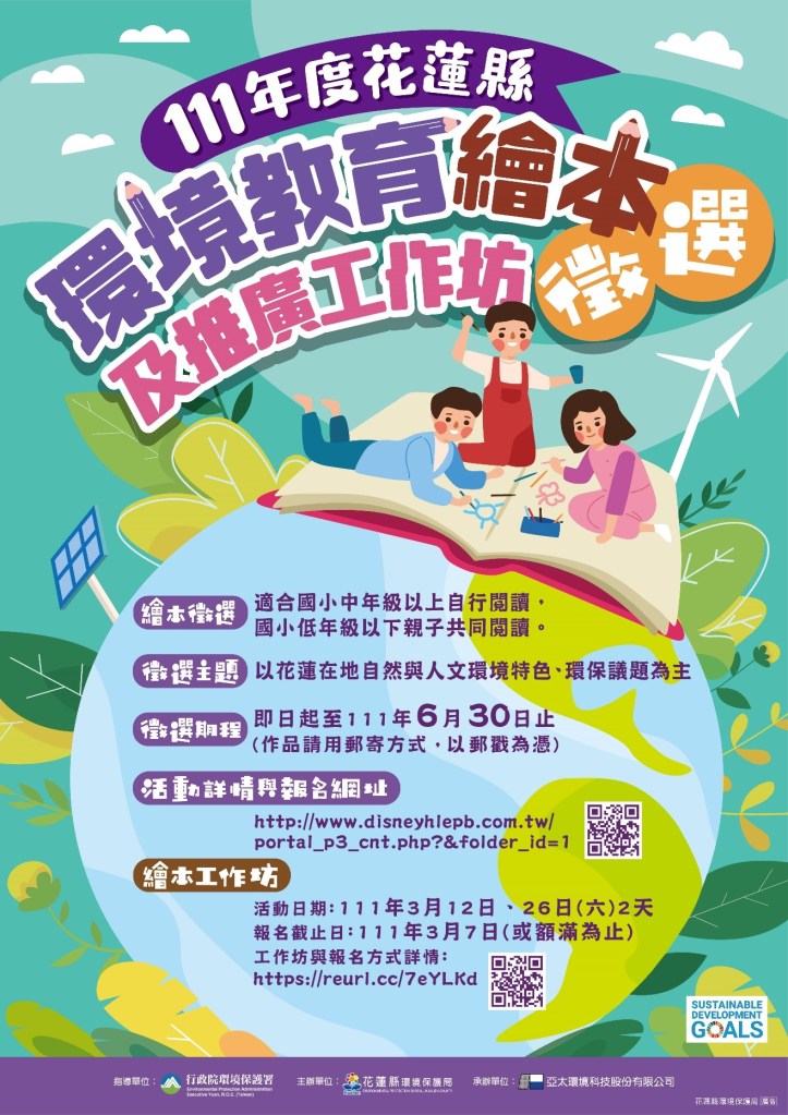 花蓮縣是國際認證的宜居城市,會與各國城市比肩,攜手發展SDGs,亦期盼透過環境教育繪本徵選,創作者用能運用SDGs的理念,將花蓮的自然環境或面臨的環保議題融入至繪本,並透過親子、師生共學的方式,讓大眾整體的環境素養能夠提升。徵選從即日起至6月30日止受理作品送件,相關報名簡章內容請至網址:http://www.disneyhlepb.com.tw/portal_p3_cnt.php?&folder_id=1 查詢。歡迎符合花蓮縣環境教育相關主題之作品或創作者踴躍投件。