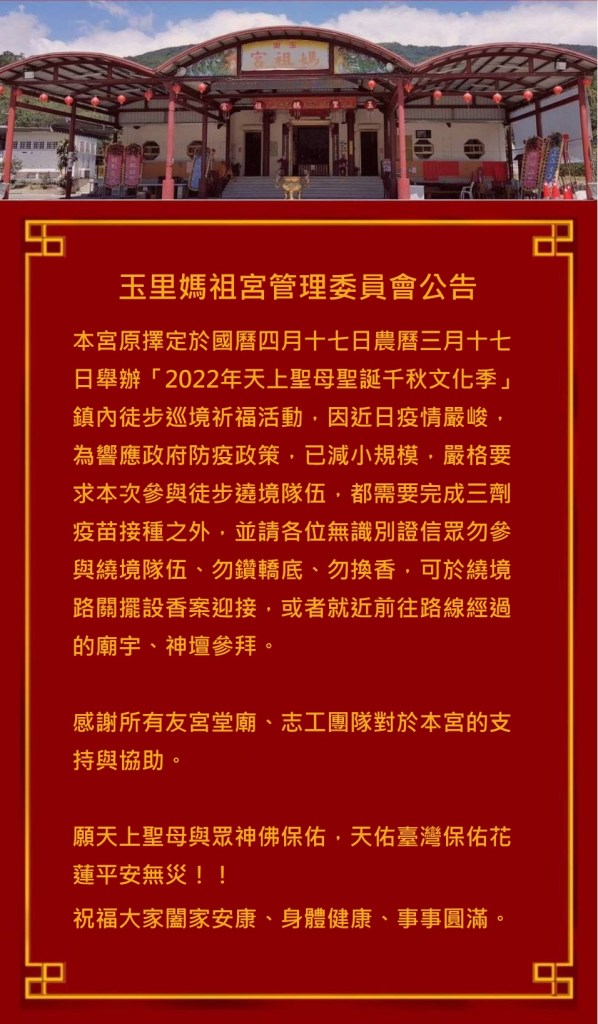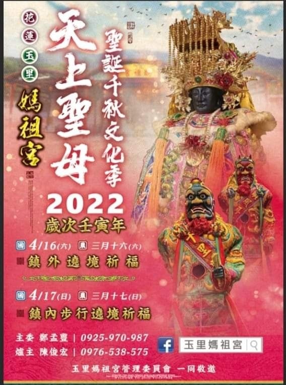 玉里媽祖宮舉辦「2022年天上聖母聖誕千秋文化季」活動,訂於本(4)月17日進行玉里鎮內步行遶境祈福。因近日台灣疫情嚴峻,為配合政府防疫政策,保障信眾安全,特發出公告,請沒有持媽祖宮發出的識別證信眾不要餐與繞境。
