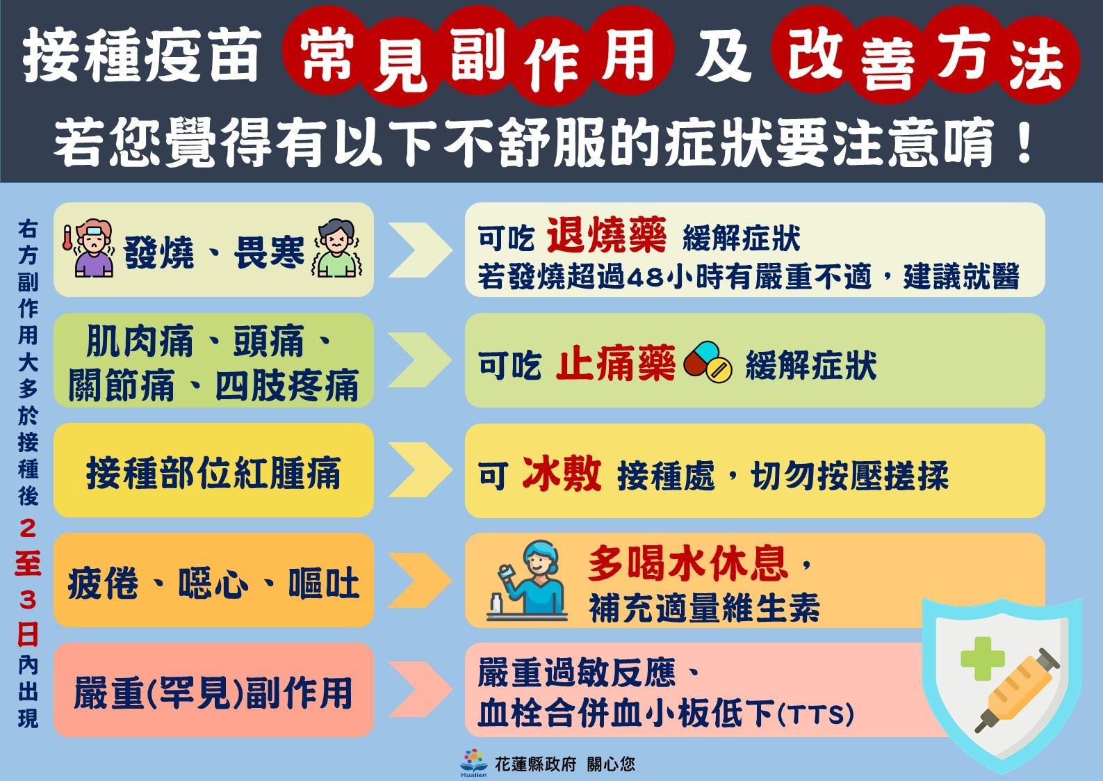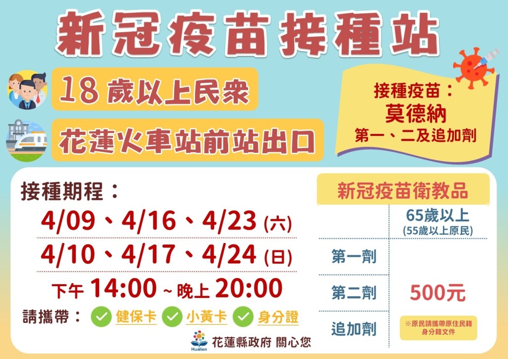 依據國家高速網路與計算中心COVID-19全球疫情地圖公布的數據顯示,花蓮縣COVID-19公費疫苗第1劑及第2劑各年齡層的覆蓋率皆達六成以上,且多數年齡層施打1、2劑皆達到八成。江鎮長感謝花蓮縣政府、花蓮縣政府衛生局及各醫護人員以最高效率全力進行疫苗施打工作,同時也再次提醒鎮民們,如果還沒施打第3劑疫苗,可上中央流行疫情指揮中心網站查詢COVID-19疫苗接種院所以及各縣市院外隨到隨打/接種站COVID-19疫苗接種地點。截至15日止目前公布花蓮縣隨到隨打的接種站為花蓮火車站,於23日及24日皆有提供莫德納疫苗接種的場次。玉里鎮接種院所有衛生所、里安診所、玉里慈濟醫院及衛生福利部玉里醫院等。
