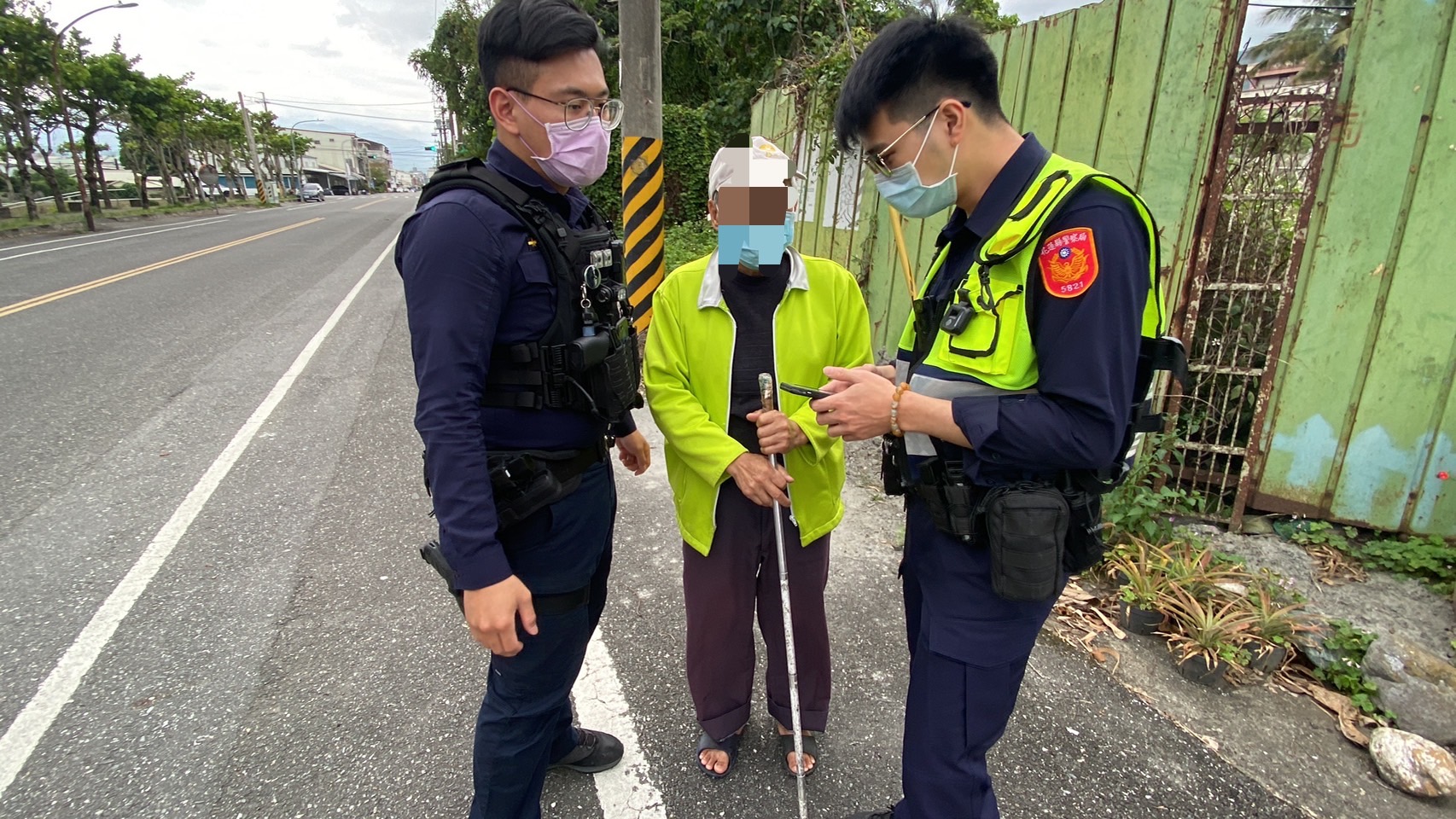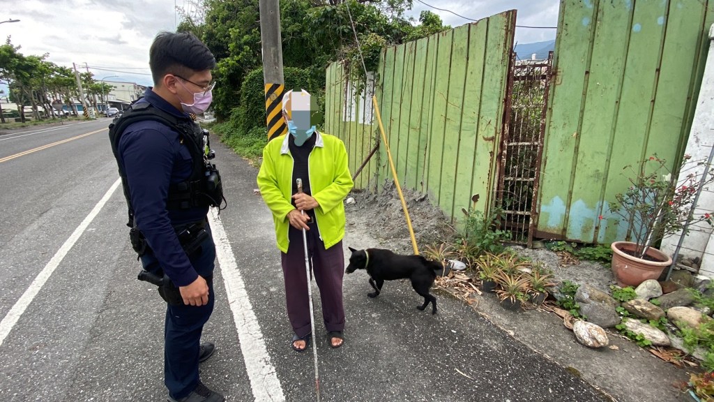 「盲盲人海來相遇,玉警攙扶送返家」,日前花蓮縣警察局玉里分局玉里派出所警員江明瑜、蕭善謙執行12至14時巡邏勤務,接獲民眾(視障人士)報案迷途,需要員警前來協助,2員連忙詢問現在位置在何處,老翁表示因為導盲犬的繩子突然脫落已經不知道自己在何處徘徊,心中感到恐懼無助,腦海中閃過的就是找人民保母來協助;員警在電話中請其留在原地千萬不要隨便走動,以免發生意外,同時安撫老翁的情緒,告訴老翁請放心,我們一定能成功找到你!2員在電話中詢問其家住在何處、導盲犬從家中出發怎麼帶路,不斷抽絲剝繭來了解其確切位置,經判斷後所幸其應離家不遠處,隨後江、蕭2員馬上來到玉里高中後門口,發現1名老翁杵著枴杖,一旁圍繞隻脖子上有圈鍊的黑狗,詢問確認該名杵著拐杖的老翁就是向警方求助的視障長者,隨即2員便攙扶老翁返回家休息。