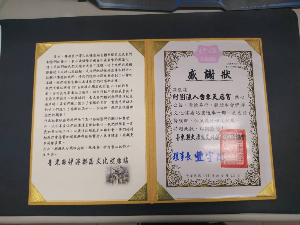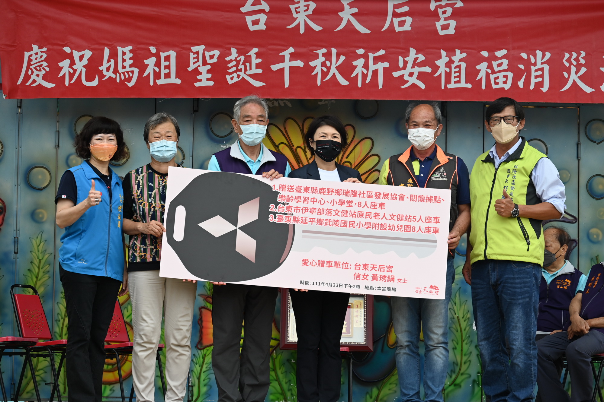 為發揚媽祖慈悲保佑眾生的精神,臺東天后宮及信眾黃女士特別在4月23日(農曆3月23日)媽祖生日,捐贈三輛車分別給瑞隆小學堂、武陵國小及伊濘部落文健站,幫助學童及部落長輩們皆能搭專車安心就學及獲得妥善照顧。饒慶鈴縣長特別親臨與會,並頒贈感謝狀給天后宮及信眾黃女士,受贈的三單位也贈送獎牌與感謝函。