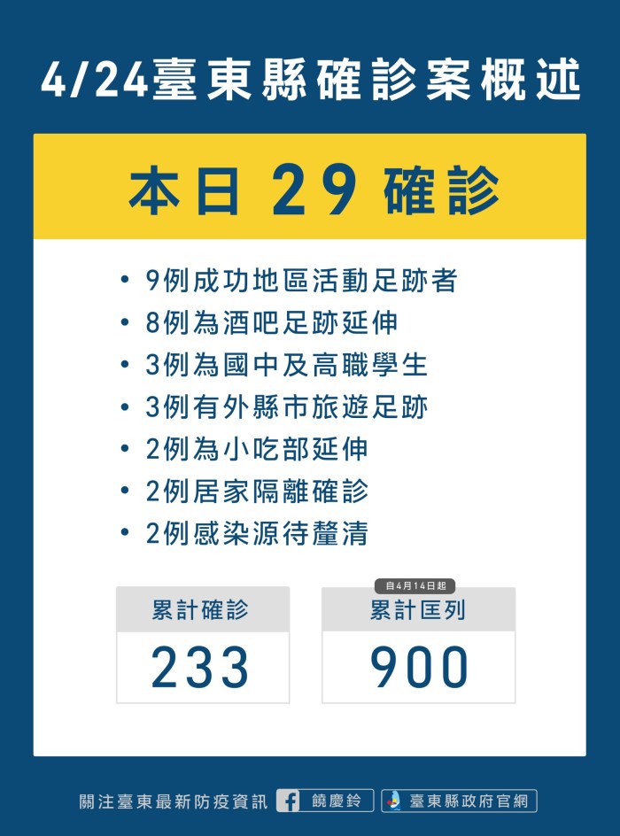 記者 姜嘉瑋/臺東報導 台東縣今(24)日新增29名確診者,從疫調結果初步推論,有9例成功地區活動足跡者、8例 … 繼續閱讀 台東今日+29 酒吧傳播鍊擴大並感染同住者明日全縣11校持續全校停課縣府呼籲有症狀應迅速就醫落實防疫