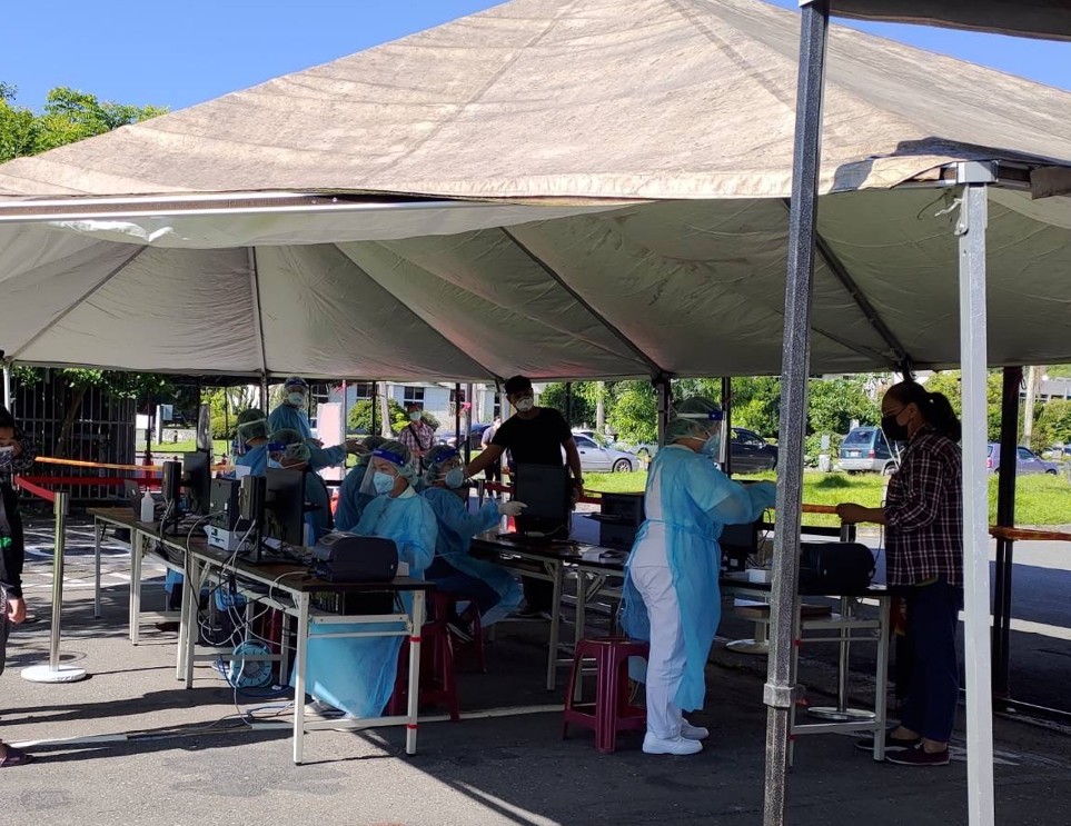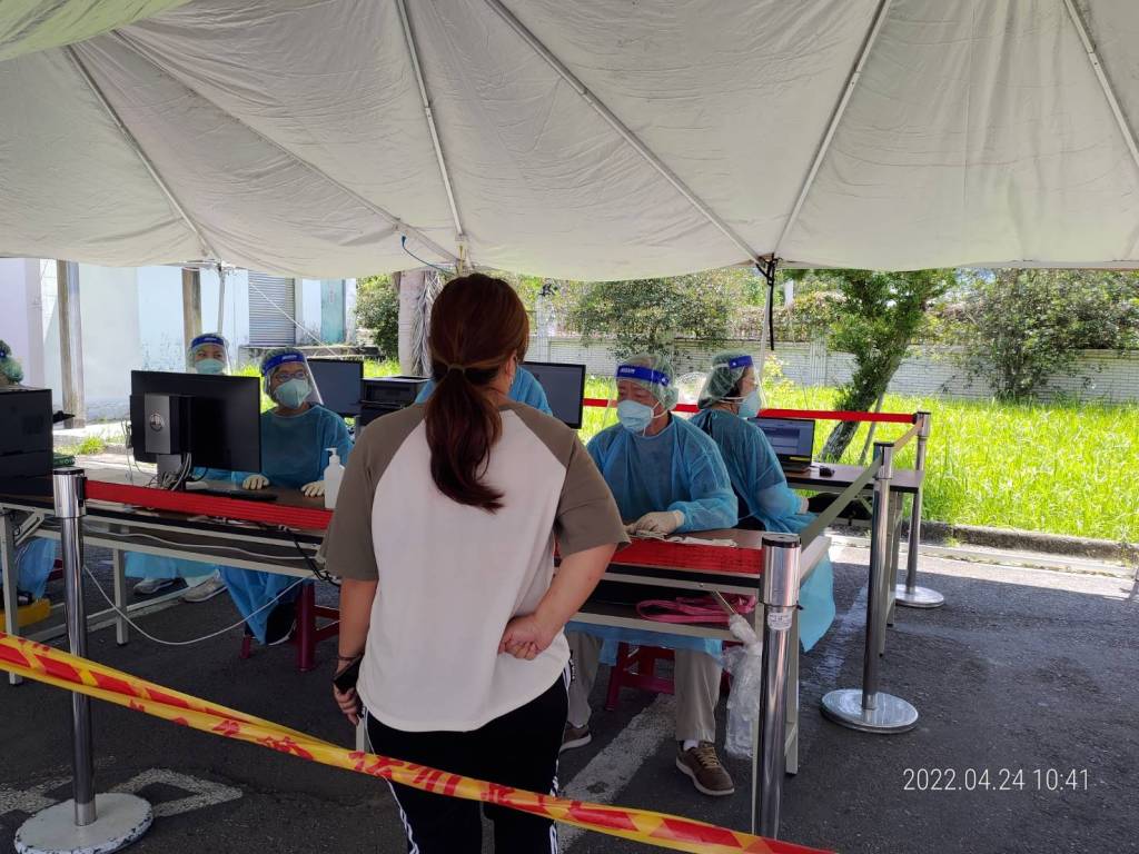 近日花蓮縣確診人數逾百人,臺北榮民總醫院玉里分院配合防應政策,成立戶外免費快篩站。