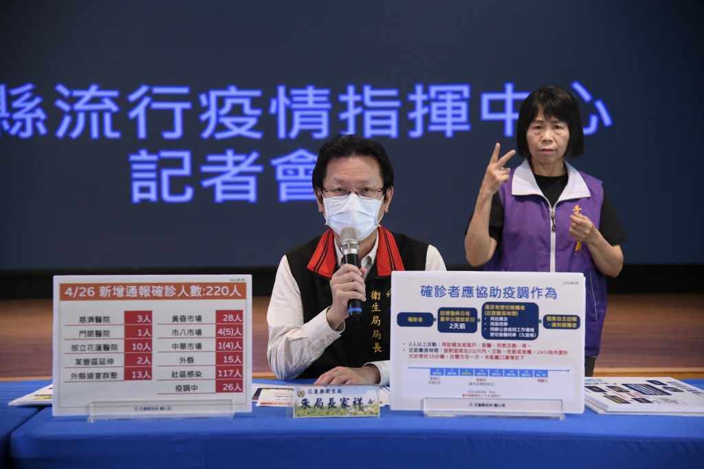 花蓮縣今(26)日新增220例新冠肺炎確診個案,花蓮縣政府召開疫情說明記者會,由縣府衛生局長朱家祥及教育處代理處長翁書敏召開防疫記者會。目前花蓮縣累積確診人數1,675人,住院129人,出院753人,居家照護累積人數744人,居家隔離累積人數5,989人,解除隔離人數4,786人,目前還有1,203人尚在隔離中。