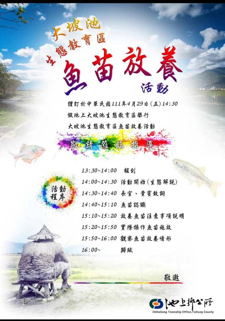 為了找回池上魚米之鄉的美名,池上鄉公所與花蓮縣水產培育所攜手合作,於4月29日下午2時在大坡池生態教育區舉辦幼魚放養活動,放養三千隻菊池氏細鯽和高體鰟鮍,邀請池上鄉親一起進行原生種魚類復育。
