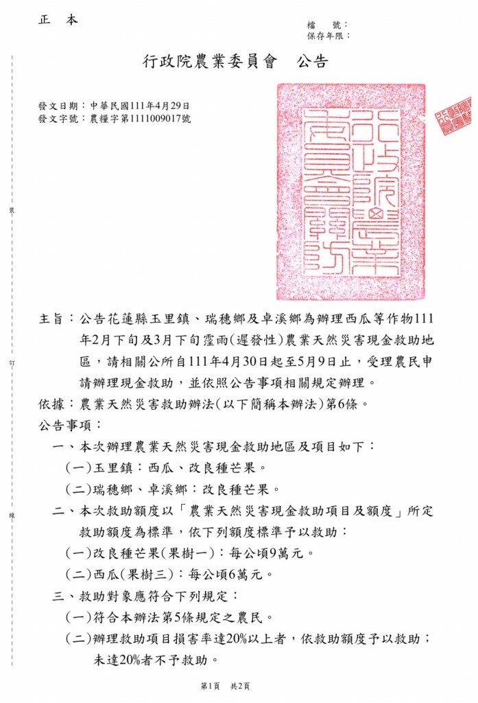 行政院農業委員會於今(29)日公佈,玉里鎮西瓜及改良種芒果於今(111)年度2月及3月下旬因霪雨造成遲發性農業天然災害,如有達現金救助標準的農民,自明(30)日起至5月9日止,可前往公所農業課辦理現金救助申請。