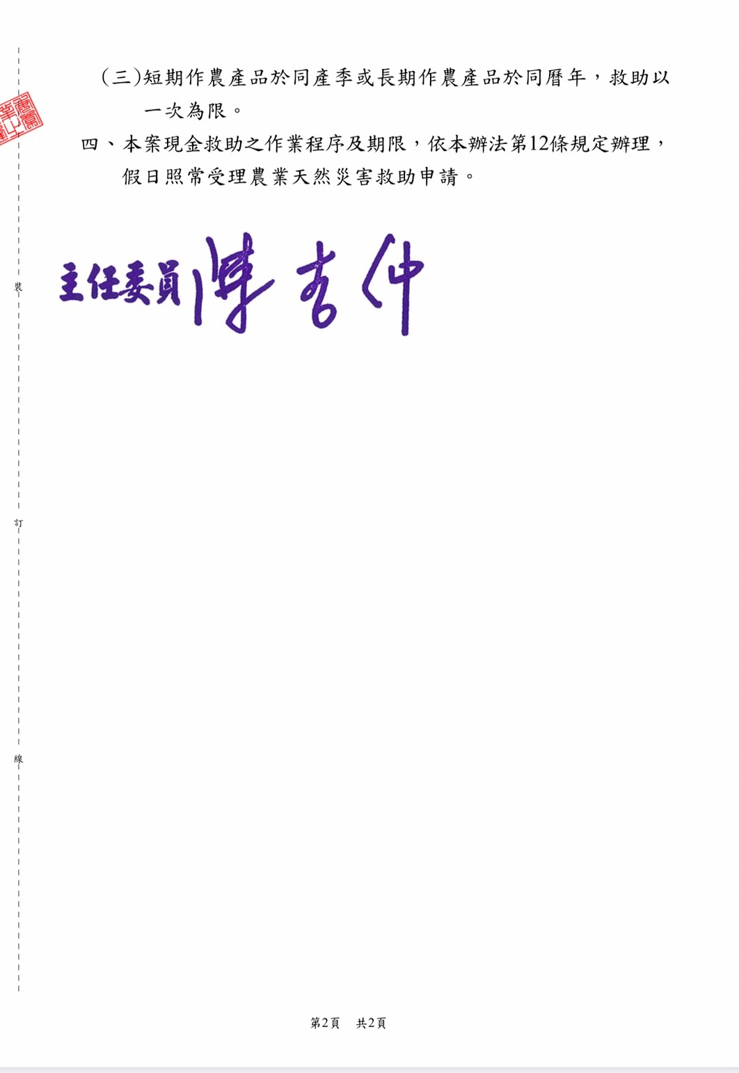 此次救助對象應為符合的規定如下:(1)符合農業天然災害救助辦法第5條規定的農民。 (2)辦理救助項目損害率達20%以上者,依救助額度予以救助,未達20%者不予救助。(3)短期作農產品於同產季或長期作農產品於同曆年,救助以一次為限。