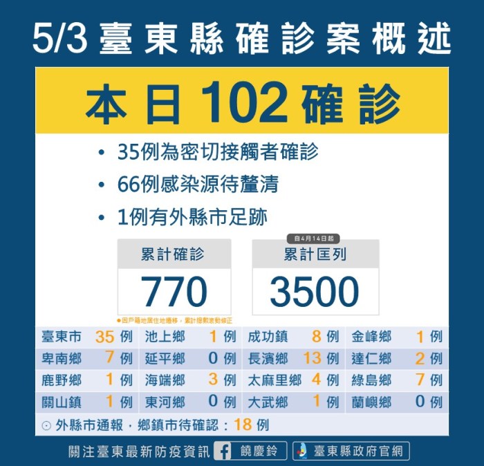 記者 姜嘉瑋/臺東報導 台東縣今(3)日新增102名確診者,84名民眾戶籍或居住地分住在13鄉鎮市、18名為外 … 繼續閱讀 台東今日+102 老人養護機構傳員工染疫 縣府立即啟動應變措施掌握情況