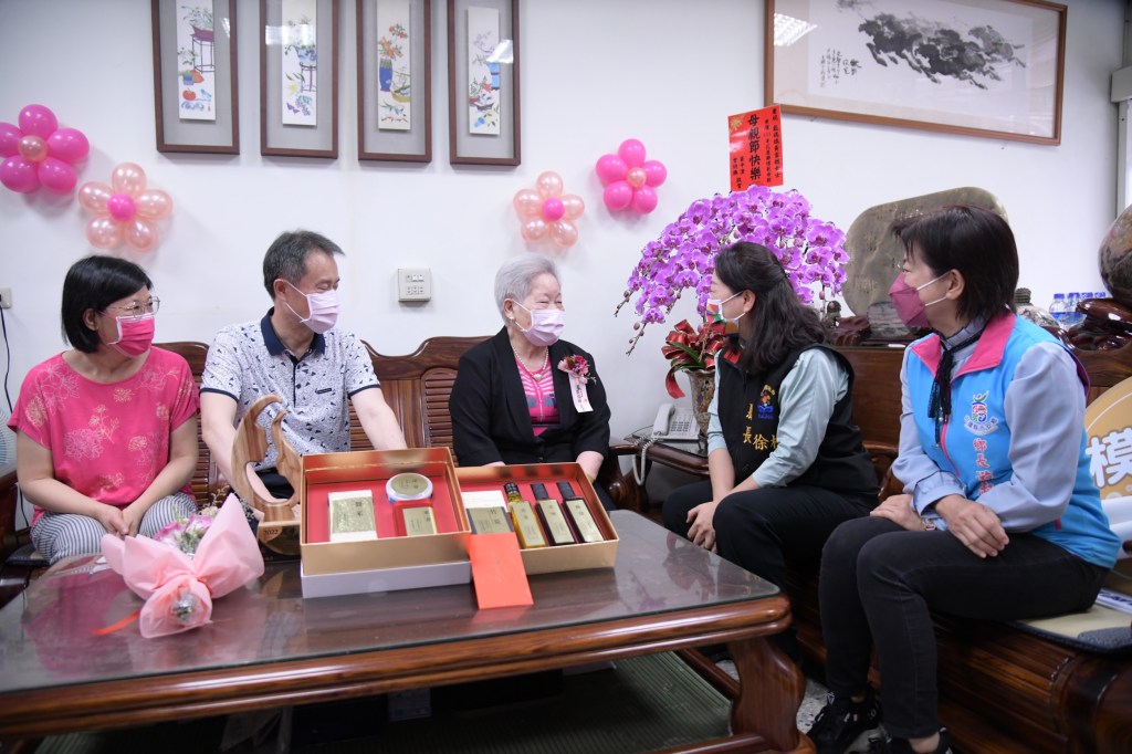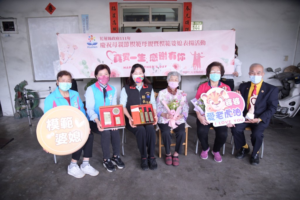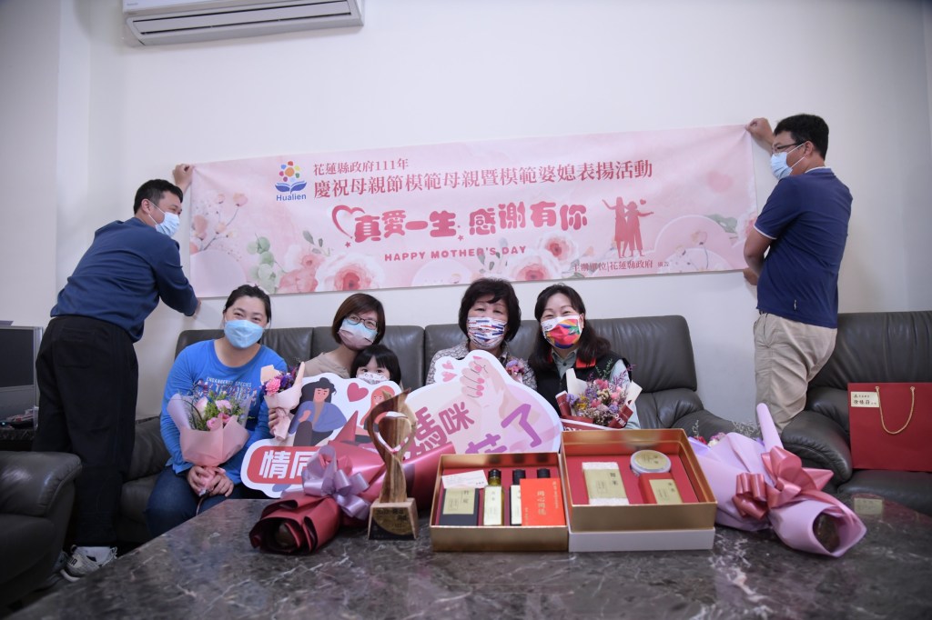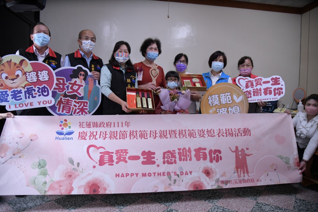 花蓮縣今(111)年新冠肺炎疫情嚴峻,花蓮縣政府一年一度的模範母親暨模範婆媳表揚大會雖因此取消,但縣府為表達對各位模範代表的敬重,在最高防疫規格下,由縣長徐榛蔚率縣府同仁至各模範代表家中,贈予木雕藝術家手工雕刻之表揚獎座、鮮花花束、七好禮禮盒以及價值2500元禮券等品項,一一表彰及給予祝福。接受縣府表揚的模範母親共有31位、模範婆媳18對,共49戶家庭。