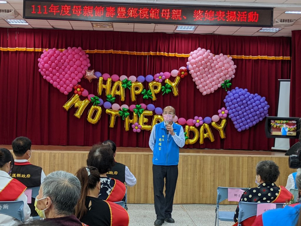 壽豐鄉公所舉辦模範母親與婆媳表揚活動,鄉長劉耀宗、志工團長曾淑懿、鄉代會主席鄭美香為模範母親與婆媳帶來祝福,劉耀宗更要求民政課團隊做好防疫與清消、座位保持距離展現貼心的行動服務。