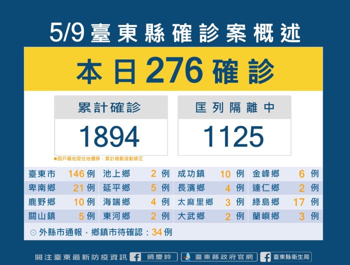 台東今日+276 綠島新增17例 養護機構新增16例 縣府呼籲民眾應作好自我保護並善加使用各鄉鎮防疫專線 減輕一線人員負擔