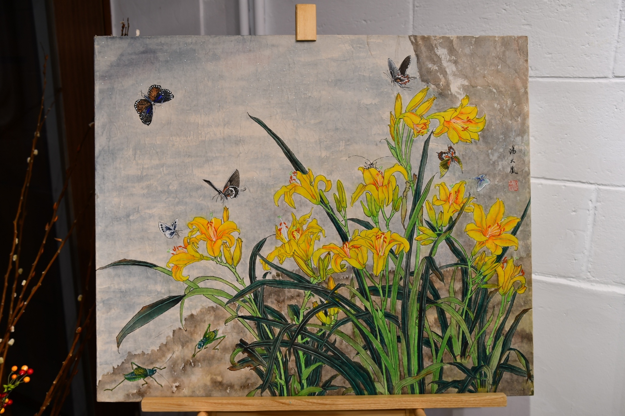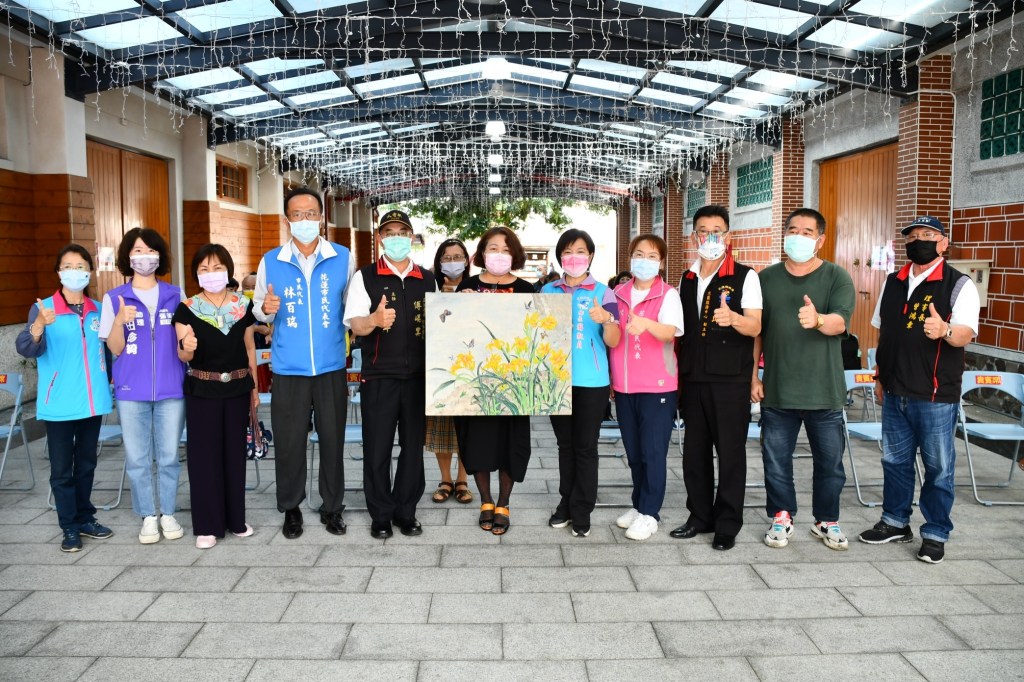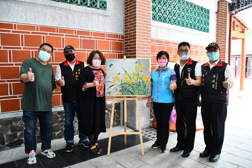 會員聯展日前盛大開幕,因適逢母親節,理事長湯大凰特意挑選一幅描繪母親花萱草作品「花香蝶自來」,致贈予公所典藏。她表示,在洛韶自家經營的果園中種植了許多特殊品種的金針花,因此特別以此為題材,使用工筆畫的蟬衣宣及水墨畫用粗麻紙托底,在油畫布材質上創作,在充滿溫馨感恩的5月結合展覽致贈給公所,更呼應每年4月至6月間在吉安鄉盛開的金針花海,不僅別具深意,亦感謝鄉長游淑貞對於在地藝文活動的支持與推廣。