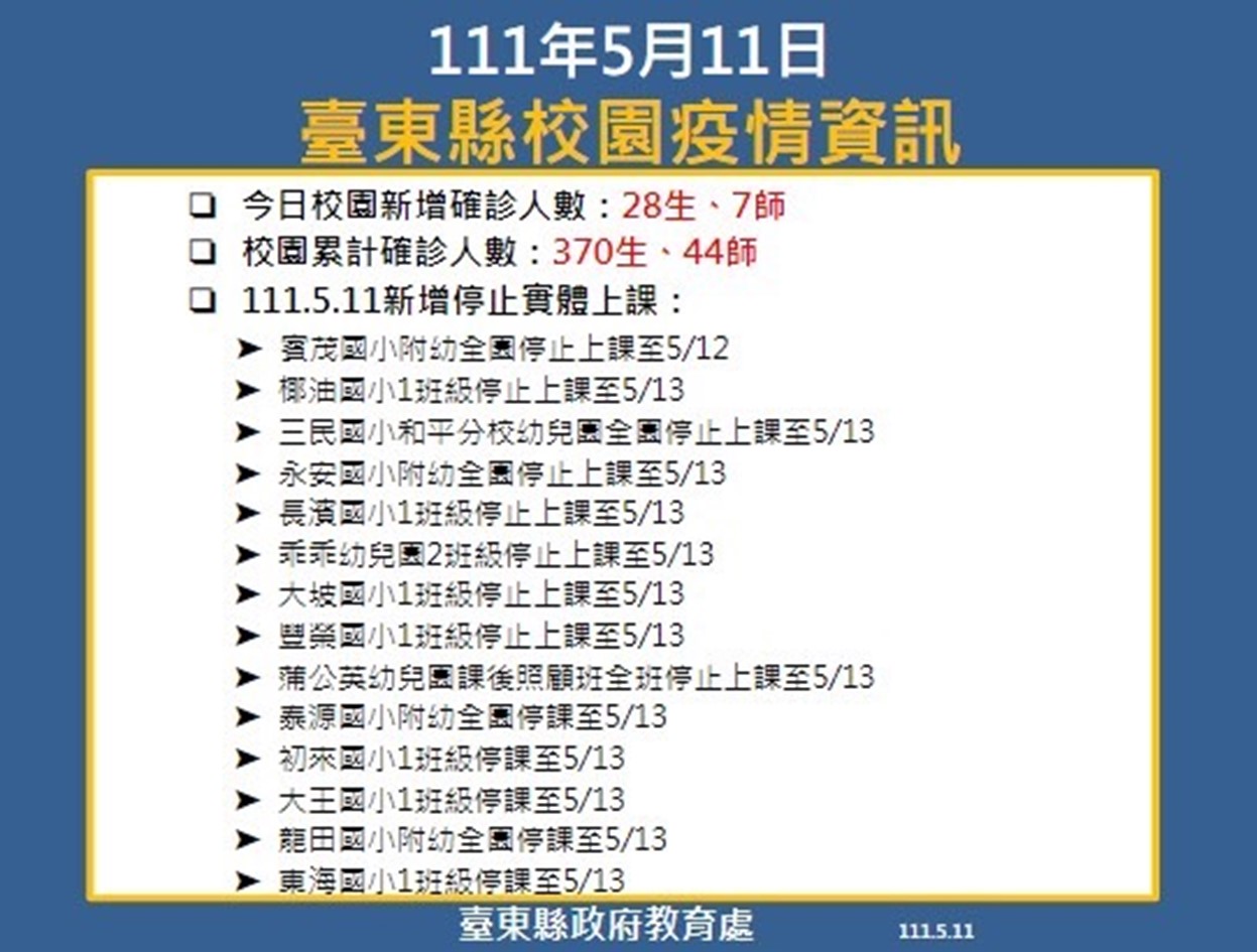 今日校園確診新增28生、7師,至今為止累計共370生、44師。在調整停止實體上課學校部分:賓茂國小附幼全園停止上課至5/12、椰油國小1班級停止上課至5/13、三民國小和平分校幼兒園全園停止上課至5/13、永安國小附幼全園停止上課至5/13、長濱國小1班級停止上課至5/13、乖乖幼兒園2班級停止上課至5/13、大坡國小1班級停止上課至5/13、豐榮國小1班級停止上課至5/13、蒲公英幼兒園課後照顧班全班停止上課至5/13、泰源國小附幼全園停課至5/13、初來國小1班級停課至5/13、大王國小1班級停課至/13、龍田國小附幼全園停課至5/13、東海國小1班級停課至5/13。