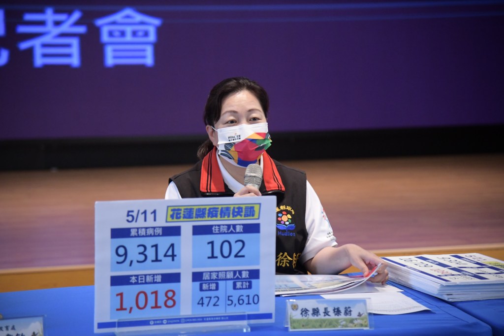 縣長徐榛蔚說明,今日全國新增確診人數5萬7,188人,花蓮縣今日新增確診人數1,018人、花蓮累積病例9,314例,住院人數102人,居家照顧人數新增472人、累計5,610人,居隔人數累計1萬6,729人,解隔人數今日新增816人、累積解隔1萬5,699例,尚在隔離中有1,030人,關懷包累計已發送5,377份。她提到,花蓮縣確診人數由5月1日單日274人至5月11日單日1,018人,但專責加護病房與專責病房使用人數大抵持平,多數確診者為輕症及無症狀。