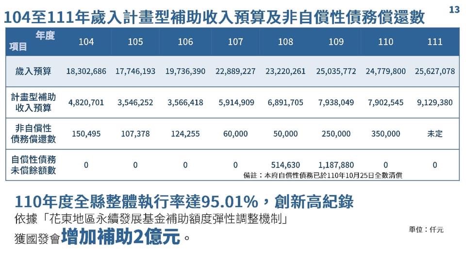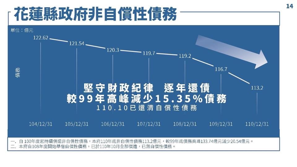 徐縣長表示,花蓮縣政府堅守財政紀律且逐年還債,非自償性債務自民國99年高峰133.74億元至今年共已減少20.54億元,總計減少15.35%債務;因應興建青年住宅所增加之自償性債務也在110年底全數清償,110年全縣整體執行率高達95.01%,並依據花東地區永續發展基金補助額度彈性調整機制獲國發會增加補助2億元。