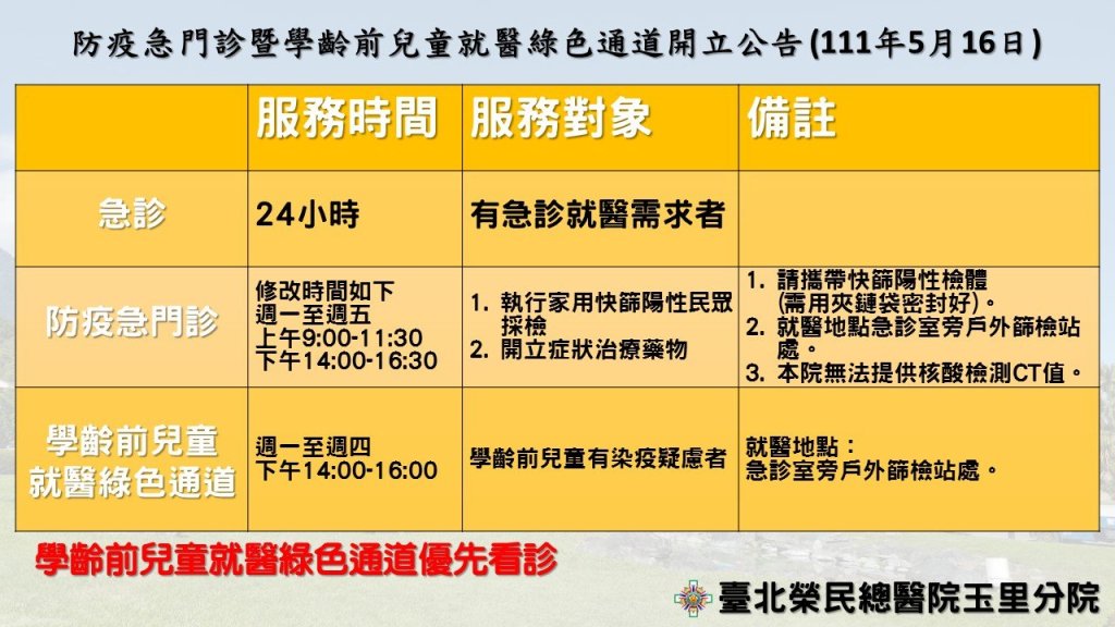 考量國內COVID-19疫情持續升溫,兒童確定病例數增加,為提供學齡前兒童(6歲以下)優先照顧,舒緩醫院急診量、避免過多就診者排擠兒童之待診時間,以及減少群聚。臺北榮民總醫院玉里分院配合政府政策,開設學齡前兒童就醫綠色通道(防疫急門診),建立兒童專用候診動線,由兒科專科醫師看診,提供學齡前兒童相關評估、採檢與診療服務。