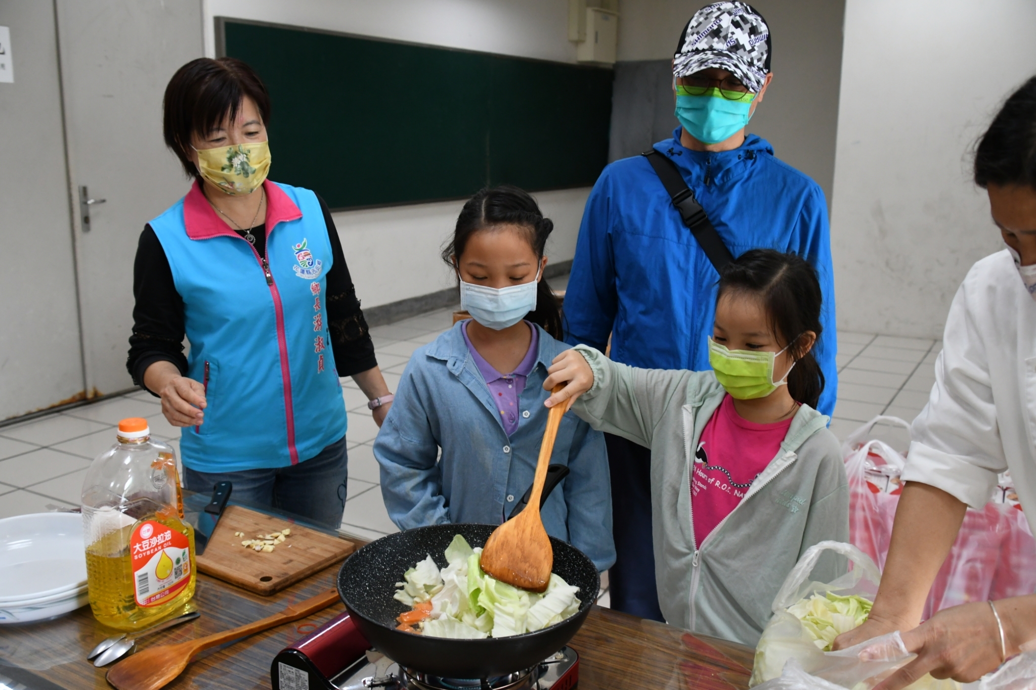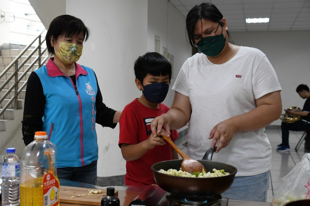 在父母與鄉長媽咪的鼓勵下,孩子們臉上帶著期待與一絲不確定,小心翼翼的打開爐火,緩緩將食材放入鍋中輕輕翻動,漸漸地爆炒噴香氣味瀰漫整個空間。在旁一步步引導孩子的媽媽說,平常孩子最討厭吃含有蒜頭的料理,沒想到透過親自下廚後,不僅切、炒、煮架式十足,且原來接受度不高的蔬果,都樣樣沒問題!