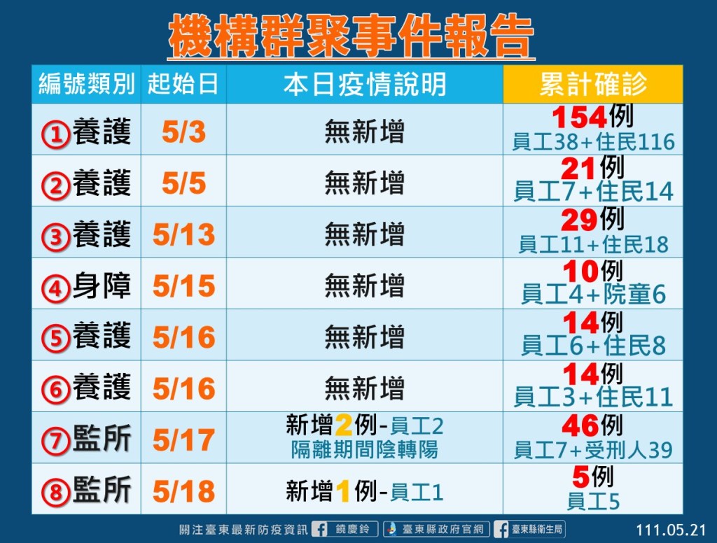 台東縣衛生局針對機構群聚說明,縣內兩間監所機構,一間新增2確診者,皆為居家隔離中職員陰轉陽,故無其他接觸者。另一間監獄今日新增1工作人員確診,5/19喉嚨有異物感,5/20出現喉嚨痛、咳嗽症狀,快篩後陽性復判PCR確診,已完成上班區域清消及接觸者匡列,目前採檢皆為陰性。養護機構部分,今日無新增,截至今日累計確診232名(員工65名;住民167名)。身障機構與兒少安置機構今日接無新增病例,衛生局將持續監測並維持相關感染管制措施。