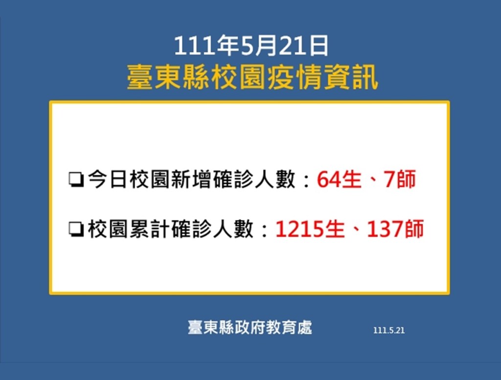 台東縣校園部分,今日則新增確診64生、7師,累計共1215生、137師。