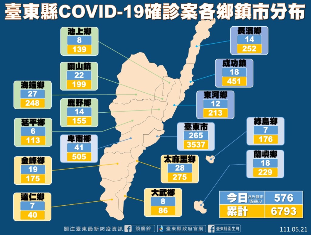 台東縣今(20)日新增576名確診者,514名民眾戶籍或居住地分在台東、62名為外縣市醫院通報。確診個案累計6793名、居隔人數2940人。